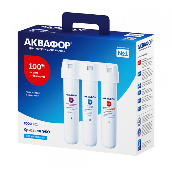 • Фильтр с половолоконной мембраной защищает от бактерий без бактерицидов. Также Кристалл Эко удаляет хлор, тяжелые металлы, пестициды, нефтепродукты и другие распространенные токсины и аллергены, сохраняя минеральный состав воды. Альтернатива обратноосмотическим системам для слабоминерализованной воды.