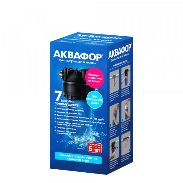 Габариты26,0 х 18,0 х 35,5 смРабочее давление воды, МПа (бар)до 6,2 атмРабочая температура, °Cот +5 до +40Присоединительные размерыG1" или G 3/4"КомплектацияГотовый фильтр состоит из корпуса и картриджа для очистки воды. Если вы приобретаете только корпус, необходимо отдельно купить подходящий к нему картридж: это может быть картридж для механической очистки воды от ржавчины, картридж для глубокой очистки воды от хлора.только корпусВодаКартриджи и корпуса фильтров рассчитаны на определенную температуру воды. Данные технические характеристики важно учитывать, поскольку от этого зависит качество очистки и срок службы фильтра.холоднаяМатериал корпусаПищевой пластик: Допущен к контакту с пищевыми продуктами. Нержавеющая сталь: Долговечный и безопасный корпус из нержавеющей пищевой стали.пищевой пластикДля холодной водыда